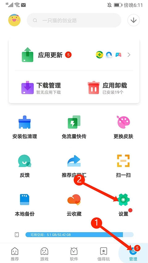 1. 开启应用汇,进入右下角的【管理】界面,接着点击【设置】选项。