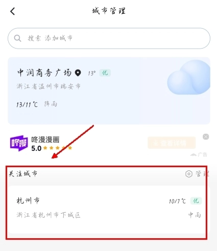 1、操作其实非常的简单,在【关注城市】右侧【管理】,点击选中;