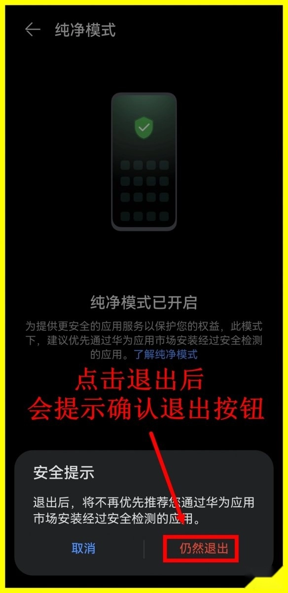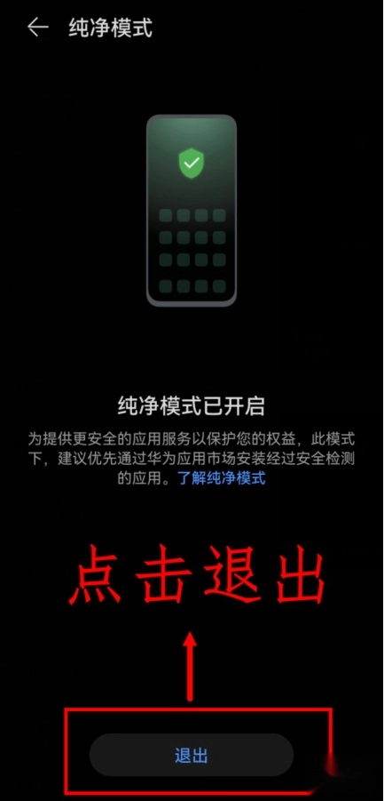 3、在纯净模式页面点击下方(退出)按钮。华为鸿蒙系统如何安装虫虫助手