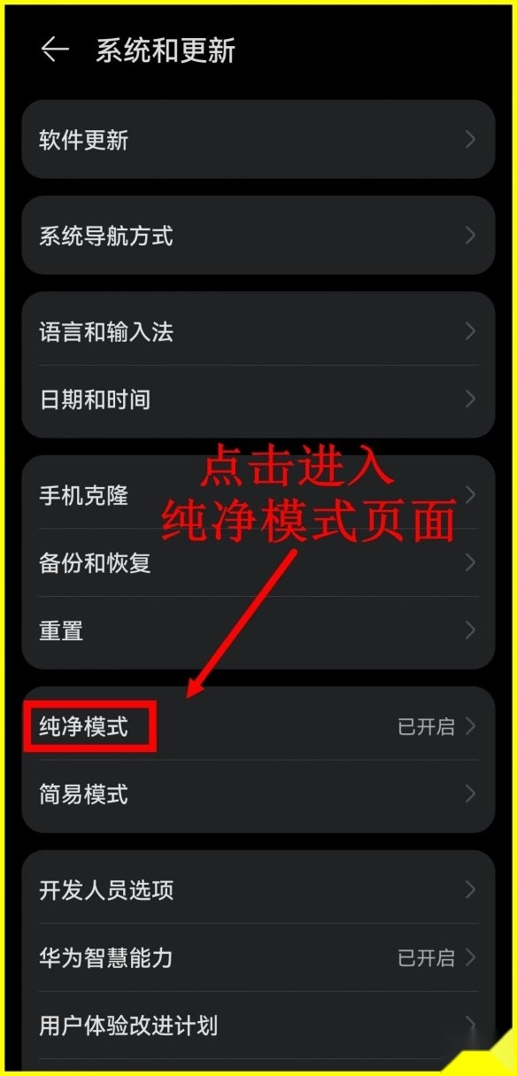 2、在系统和更新页面点击方框内(纯净模式)页面。