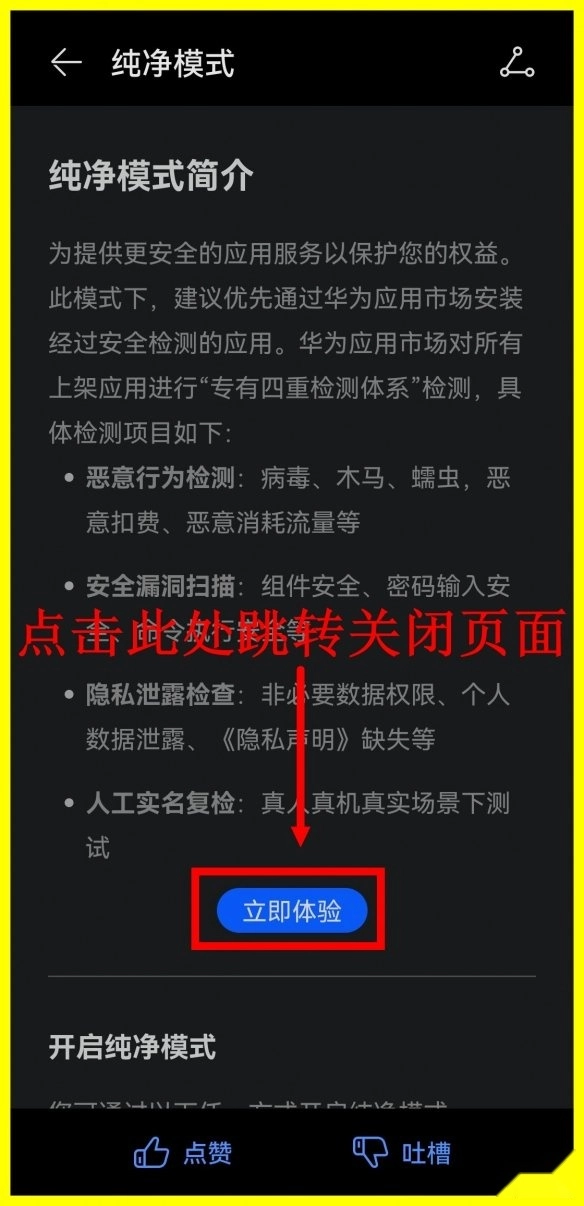 2、此处为纯净模式介绍,点击下方(立即体验)跳转关闭页。