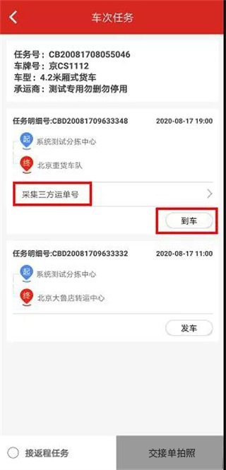 6、采集运单号,方式包括手工输入,完成后点击“到车”。