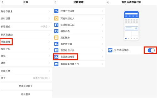 4、如果你想关闭首页活动推荐,可以依次点开支付宝「设置」-「功能管理」-「首页活动推荐栏目」进行操作,如下图所示:
