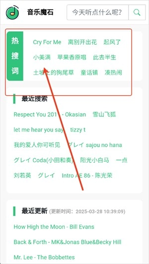 2. 打开并进入软件后,能够依据热搜词筛选自己喜爱的歌曲内容。