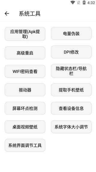 7、点击进入系统工具,其中包含应用提取、电量伪装、高级重启、DPL修改等功能。