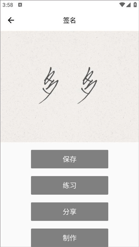 3、用户随意点开已生成的某一款字体签名,能够对该签名进行保存、练习或者分享操作。