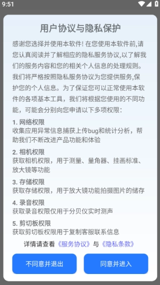 1、需在线阅读用户协议与隐私保护内容,同时开启各类权限,点击“同意并进入”。