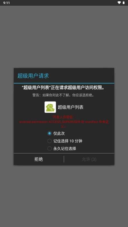 先安装“超级权限管理器”应用,安装完成后将其打开,接着授予该应用root访问权限。