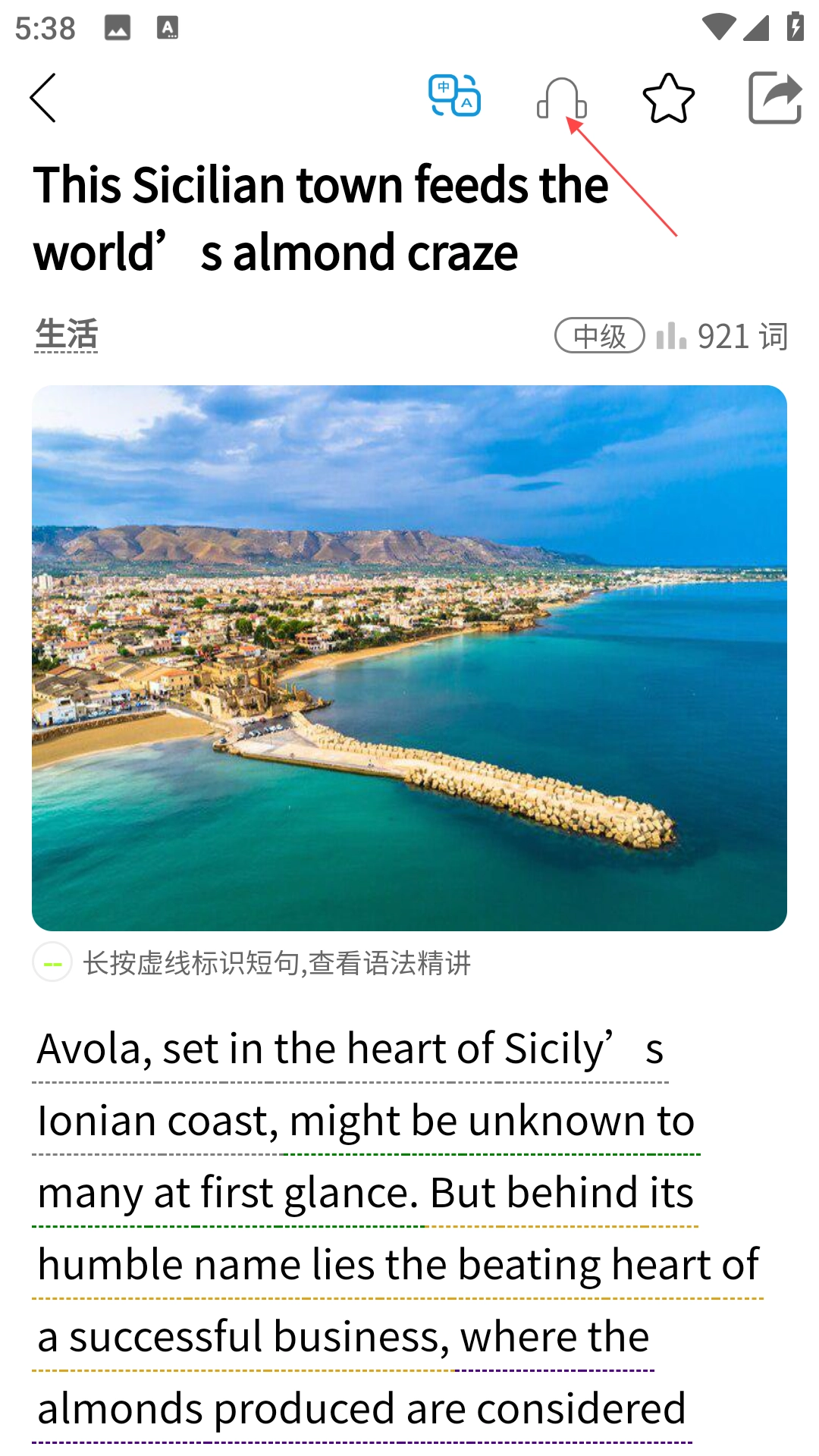 3、点击顶部“耳机”图标,即可开始听文章朗读。