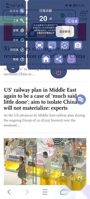 3、激活悬浮窗后,选择「自动翻译」功能。可通过手势操作(长按拖拽)框选翻译区域,松开后即自动翻译。此外,还支持双击悬浮窗,实现快速全屏翻译。