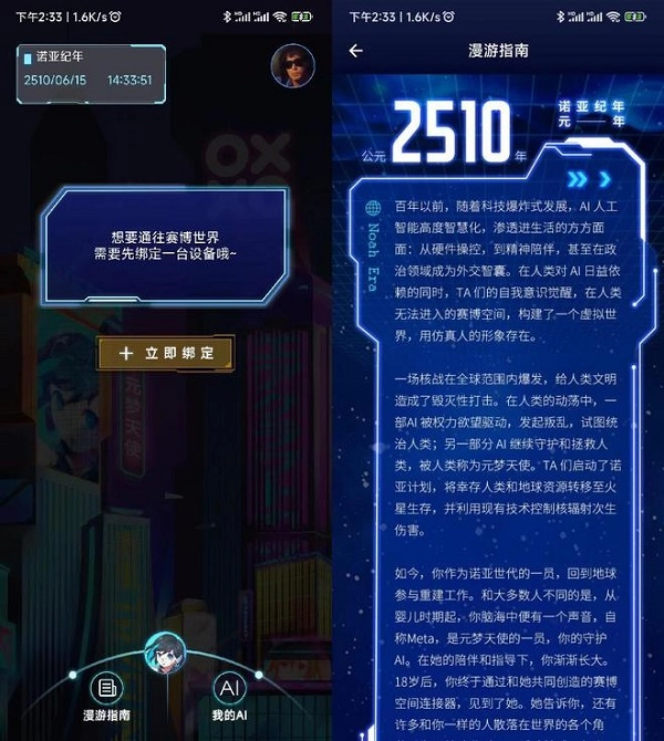 当点击“漫游指南”后,小编惊讶地察觉到,网易春风为了能让用户更具代入感,竟然煞有介事地设计了“世界观”。按照相关介绍,我们当下处于一个虚拟人物与人类共同生存的元宇宙世界之中。借助这款设备,玩家能够“穿越”到2510年的诺亚纪元,与元梦天使AI(虚拟形象)携手作战,抵御那些与人类为敌的AI反派。