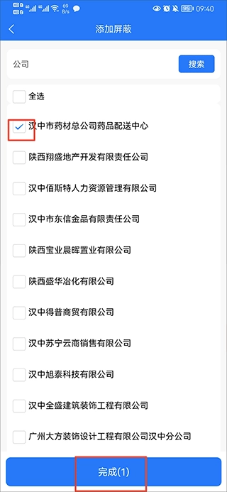 3、在搜索框中输入企业名称,勾选后点击完成即可