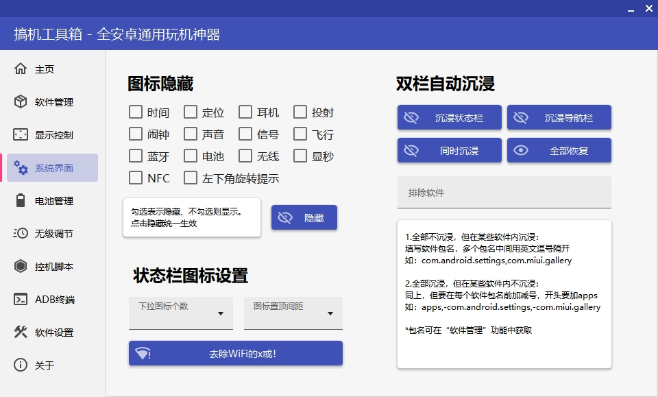 在系统界面,可进行图标隐藏、双栏自动沉浸以及状态栏图标设置等方面的修改。
