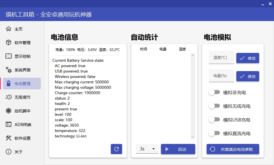 在电池管理板块,能够查看电池信息、实现自动统计功能,还可以进行电池模拟等操作。