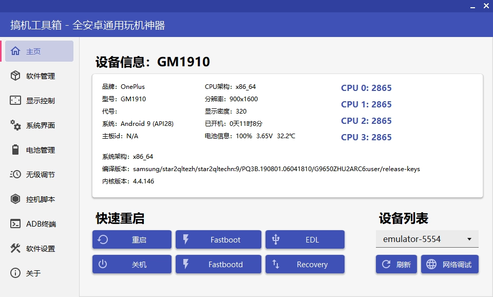 搞机工具箱 搞机工具箱电脑版迎来重大更新,现已升级至 v10 版本!这可是免安装的桌面版,简单解压就能免费畅用,完全不收取任何费用,而且无需 root 权限!作为 PC 端全安卓通用的玩机神器,搞机工具箱 PC 版让你在电脑上轻松掌控手机,实现远程操作。它还支持软件管理、电池管理、显示控制等丰富功能,绝对是玩机达人不可或缺的搞机软件。并且,它的内存占用极小,仅约十 M ,快来体验一番吧!