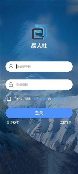 1、初次使用时,需点击登录页面右下角的“立即注册”,按顺序填写姓名、身份证号、密码以及手机号(填写两遍),同时勾选《易人社手机用户条款》,即可完成用户注册。已注册的人员可跳过此步骤。