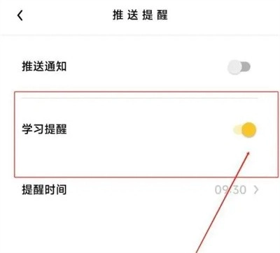 3.接下来在推送提醒界面里就可以看到“学习提醒”功能了,在它的后面点击对应的开关按钮去设置,当按钮显示为彩色时代表成功开启,再在“提醒时间”后面设置选择提醒的学习时间即可。