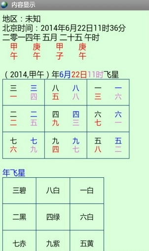 程序包含的内容有:年飞星、月飞星、日飞星、时飞星,当天适宜修造的方位,以及年神煞、月神煞、日神煞。