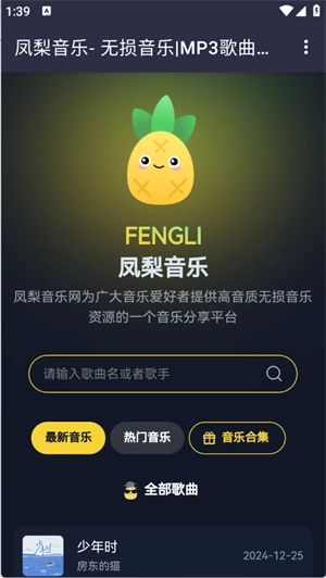 凤梨音乐免费版 凤梨音乐是一款汇聚了海量音乐资源的音频应用,不管是当下热门的流行歌曲,还是经得起时间考验的经典老歌,用户都能在这里轻松找到。借助便捷的搜索功能,用户可以通过歌曲名或歌手名快速找到自己喜欢的音乐。这个平台凭借丰富的曲库、流畅的播放速度以及及时的新歌更新,为用户打造了一个免费畅听的音乐天地。