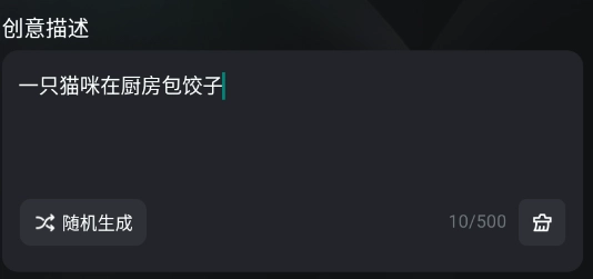 你可以在这里填写想要生成的内容描述,无论是中文还是英文都能支持,不过总长度要控制在500字符以内。要是暂时没有头绪,也能点击随机生成来获取灵感。为了让结果更贴合预期,建议你提供具体且明确的提示信息,比如可以按照“核心对象+其行为表现、自身特点、所处场景、传递的情绪+发生的时间+周围的环境+具体动作+材质触感、画面布局、色彩风格、细节刻画”这样的框架来组织语言。