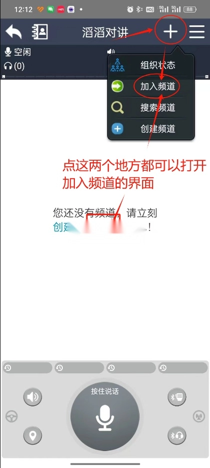 2. 如何加入频道接下来要介绍的是本期教程的核心内容:加入频道的具体操作步骤。图4展示的是「滔滔对讲」App的主界面,按照图示操作,点击空白区域的“加入”按钮,或者点击上方加号菜单里的“加入频道”选项,就能打开用于填写频道号和口令的信息界面(见图5)。
