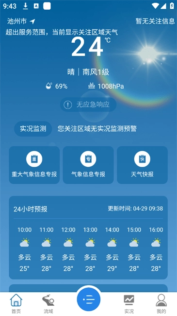 支持天气实况功能,能查看当前所在地区的降水、气温、风力、能见度等实时气象信息。