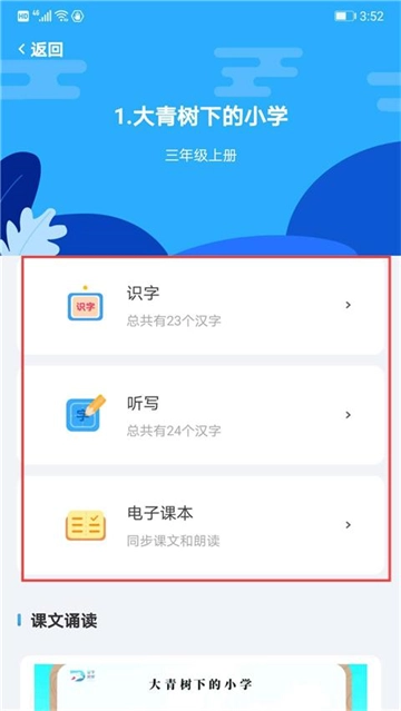 打开指定课文后,可借助识字练习、听写训练以及电子课本这三种方式来推进学习进程。