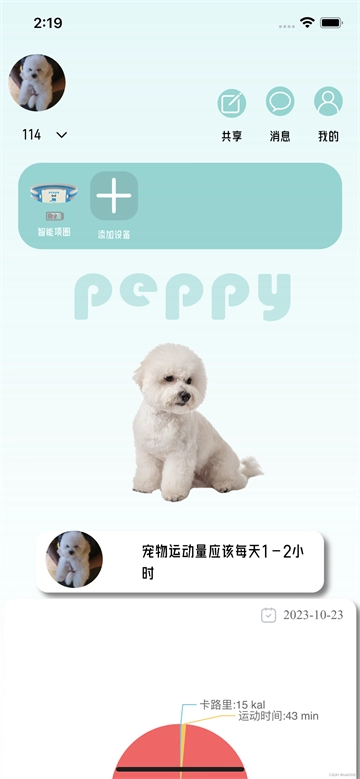 登录手机后进入登录界面,输入手机号与验证码就能进入主页,具体可参考下图。主页的核心功能是展示并管理宠物及设备相关信息。下图中呈现的是一只名为114的宠物小狗,它佩戴着一个智能项圈。