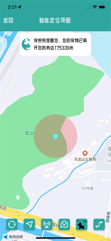 点击智能项圈后,就能进入项圈定位界面,地图上会同步显示手机与狗狗的实时位置。界面下方设有六个功能按键,依次为:刷新定位、导航至狗狗当前位置、雷达寻宠、电子围栏、电子牵引以及历史轨迹。
