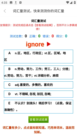 进入首页后,点击【词汇量测试】图标,即可了解自己的词汇量情况。