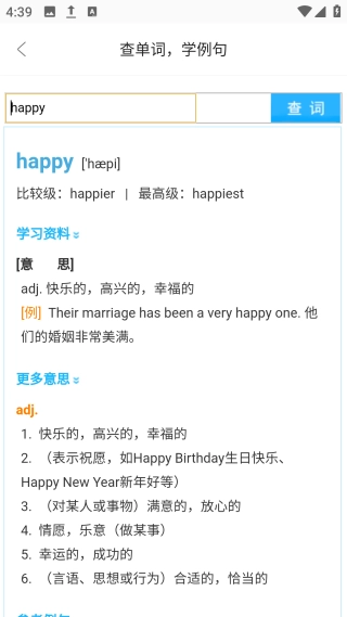 点击【单词例句】图标,可查单词,学例句。