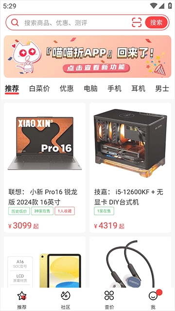 喵喵折设有社区板块,用户能在这里看到其他用户分享的购物攻略内容,为自己的购物决策提供参考。此外,用户也可以在社区里提出自己的疑问,向其他用户求助,从而一站式解决购物过程中遇到的各类问题。