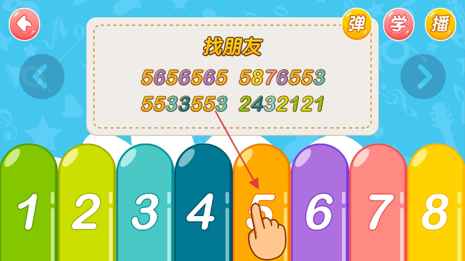 按乐谱指引,点击对应数字琴键,弹奏学习歌曲。