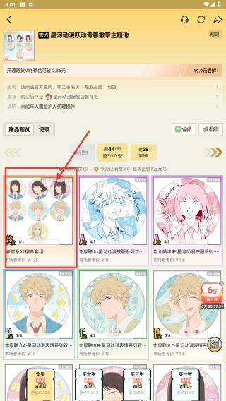 在谷子相关商品展示界面,找到星间动漫合作推出的青春徽章专属卡池,点击进入该卡池的详情页面。