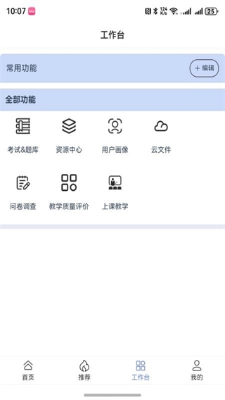 当您点击页面底部的“工作台”选项后,就能看到考试与题库、资源中心、云文件等相关功能模块。