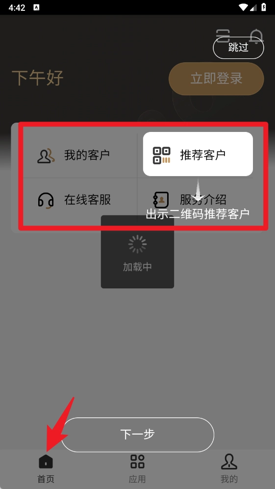 进入首页后,你可以使用我的客户、推荐客户、在线客服以及服务介绍这些功能。