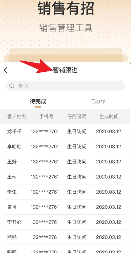 在营销跟进页面,能够查看客户任务的状态,以便及时处理待办事项。