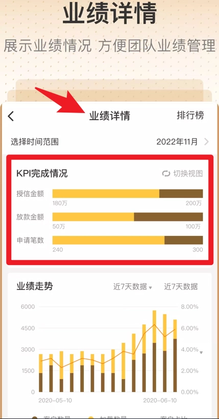 切换至业绩详情页面,查看KPI完成状况及业绩趋势,便于开展团队业绩管理。