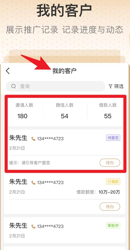 在客户页面,您能够查看推广记录、了解授信及借款进度,并实时掌握客户的动态信息。