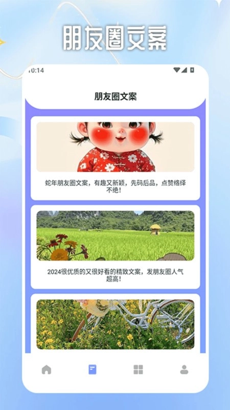 以后你就能在平台上获取各类朋友圈文案,用户也可以挑选自己心仪的文案来使用了。