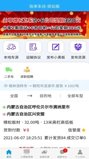 信来车往货站作为物流配货平台,可帮助用户精准查询本地货源与车源,满足司机和货主的需求。货主线上就能发布运输需求,支持文字和语音两种发布方式,任选其一即可;按照信息提示完善资料,填写装货地址、卸货地址、货物名称、运费付款方式等信息后,就能快速发布货源,方便车主查找。车主则能根据常跑运输路线、目的地地址和车型种类精准找货源,也可发布车源信息,便于双方互动;通过平台提供的联系电话,还能直接联系对方,实现即时沟通。