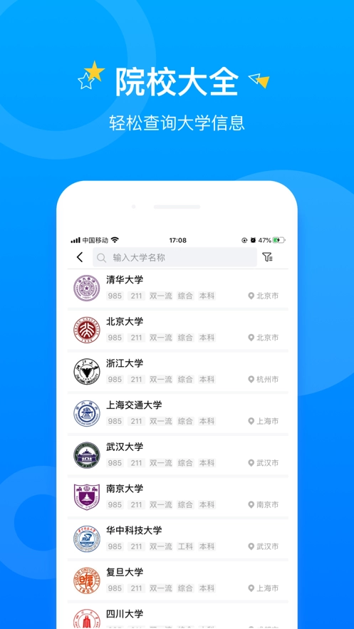 数据精准全面,覆盖全国2800多所高校,高校招生录取数据实时更新,支持分数、专业、院校查询,大学排名与学科评估信息一目了然。