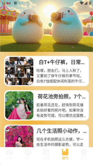 在技巧页面里,你能随时获取各类拍照小窍门,帮助用户更高效地掌握相关知识。