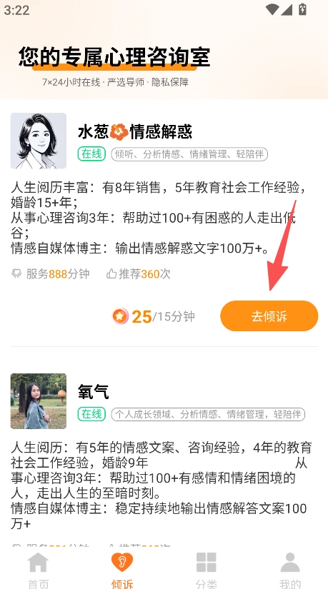 进入倾诉板块,选择咨询师,点击去倾诉。