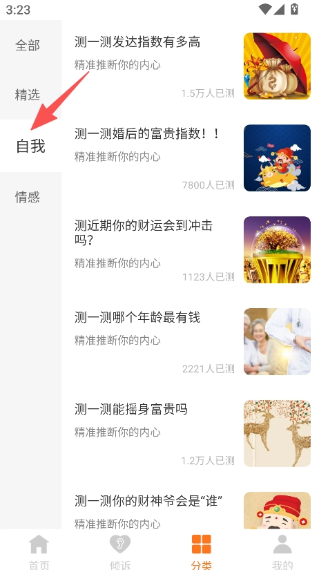 具备分类测评的功能,包含自我、情感等不同类别,用户可以根据自身需求进行测评,从而更系统地探索心理维度。