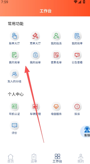 工作台主要整合了常用功能与个人中心相关内容,这里集中了所有核心使用模块,无论是日常需要的抢单、竞单操作,还是车辆管理类的相关事务,都能在此完成。