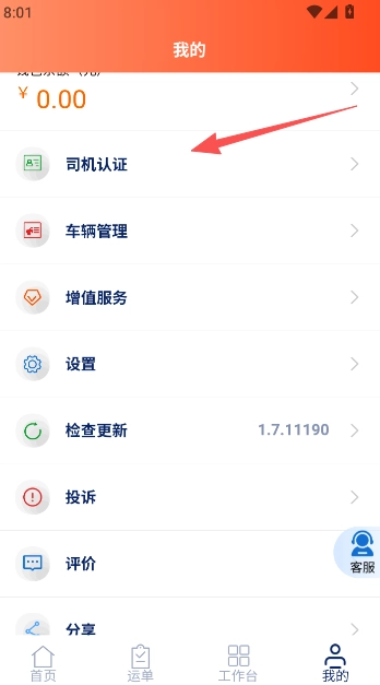 点击我的功能版块,选择司机认证功能服务。
