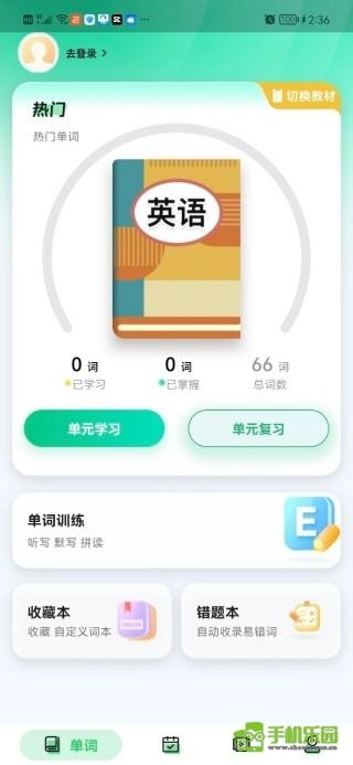 在单词页面,你可以查看各类教材,进行单元学习与单词复习,还能了解单词训练、收藏本以及错题本等功能版块。