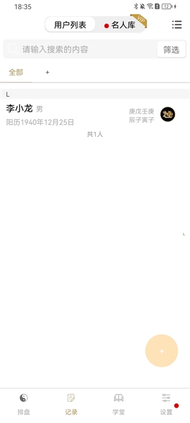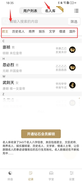 点击名人库,能查看君主、历史名人、商界、娱乐、文学等不同领域名人的完整八字信息,点击顶部搜索框也可快速查找目标人物。