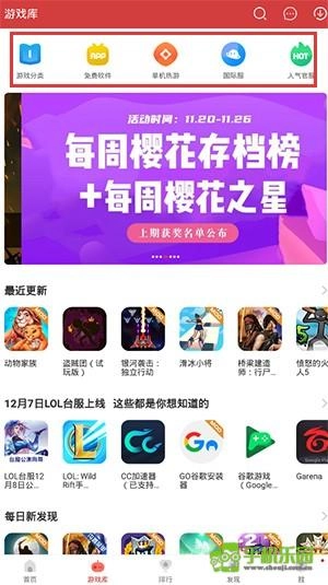 打开游戏库,能看到游戏分类、免费软件、单机热游、国际服等不同类型的游戏推荐。